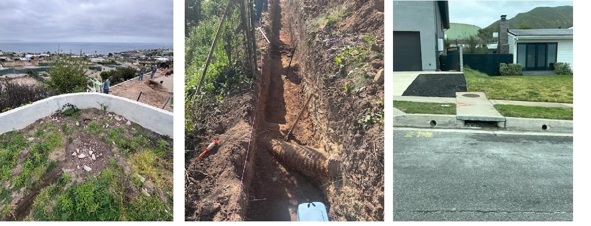 One of these systems affects approximately 2/3 of our homes. In many cases these drainage systems have been working as intended and homeowners may not even be aware they run under their property. However, with so many homes lost to the fire, and with all the compacting, digging and foundation work, there is now a high likelihood of these pipes getting cut or damaged. This would create a leak under the lower home, and possibly a very expensive problem to fix, especially once a new slab is built on the lot.